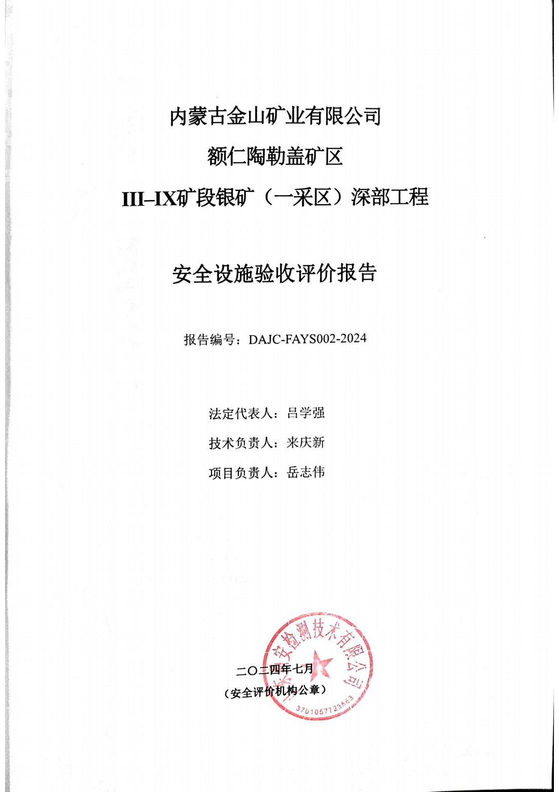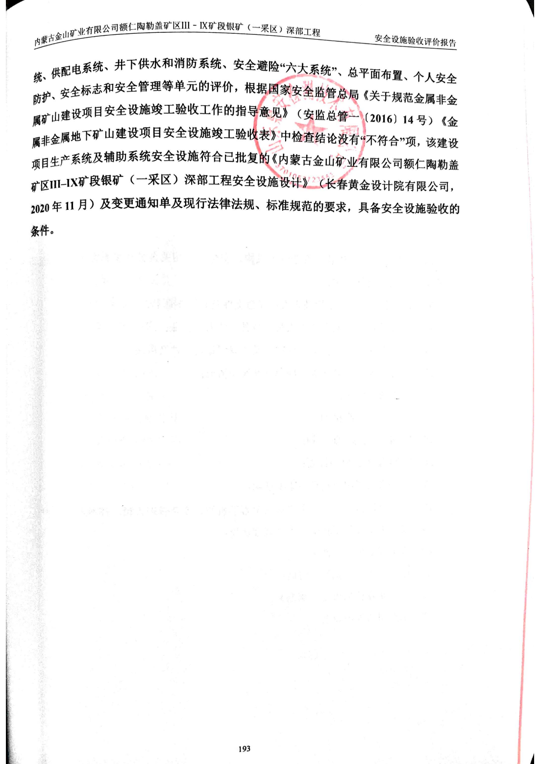 評(píng)價(jià)項(xiàng)目名稱 | 內(nèi)蒙古金山礦業(yè)有限公司 額仁陶勒蓋礦區(qū)Ⅲ–Ⅸ礦段銀礦(一采區(qū))深部工程 安全設(shè)施驗(yàn)收評(píng)價(jià)報(bào)告 | |||||||