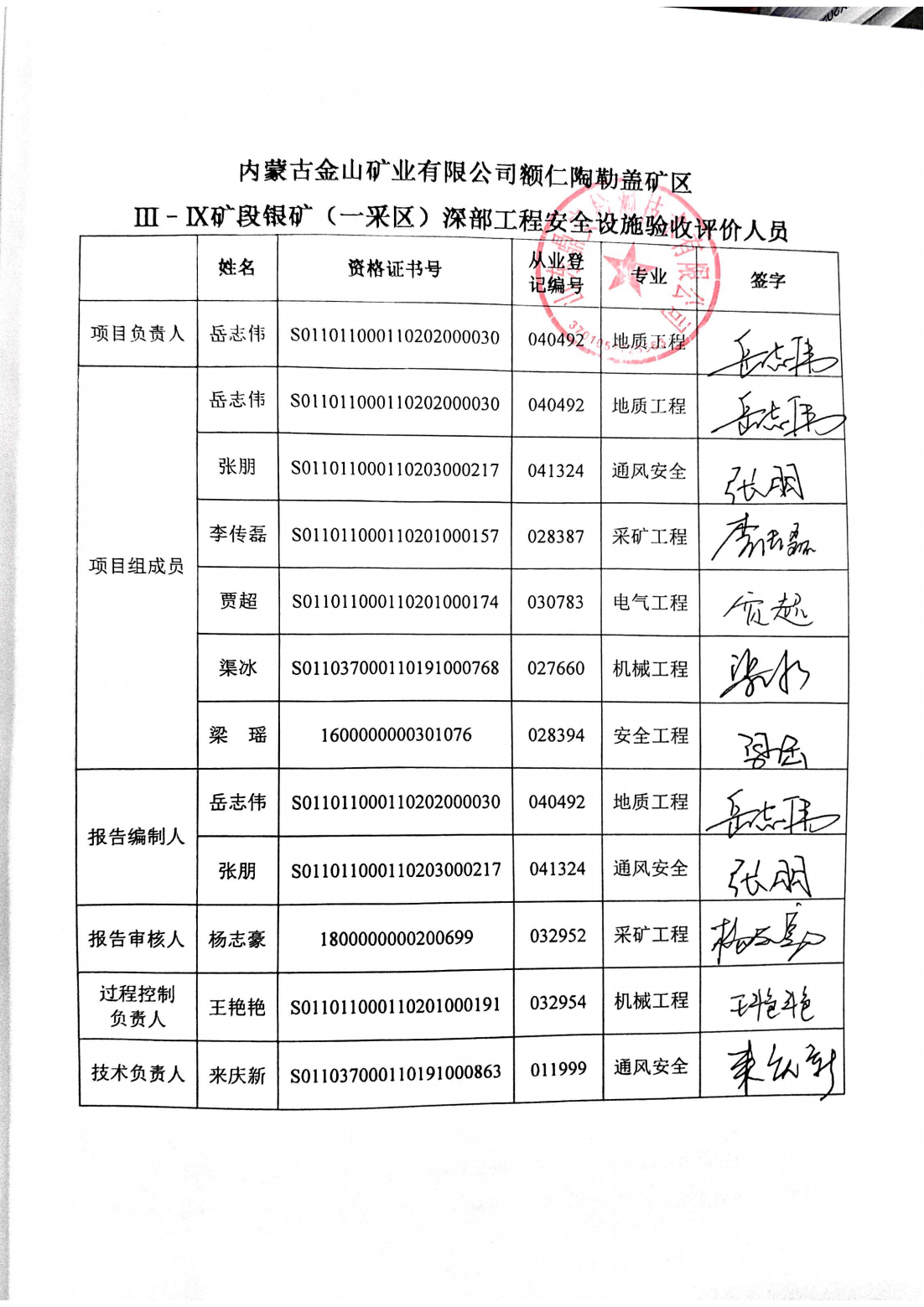 參與安全評(píng)價(jià)工作的注冊(cè)安全工程師:岳志偉、張朋、李傳磊、賈超、渠冰、梁瑤 | ||||||||