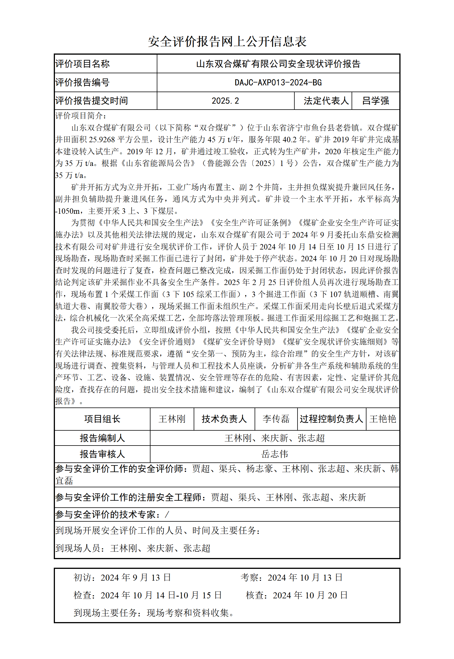 山東雙合煤礦有限公司安全現(xiàn)狀評價-網上公開信息