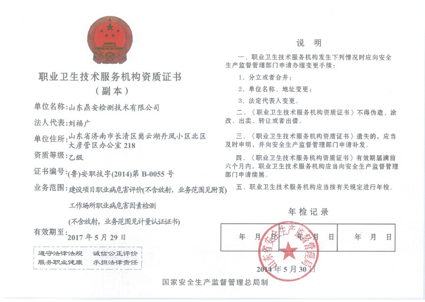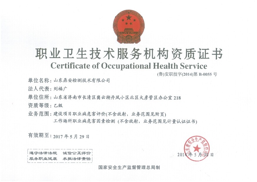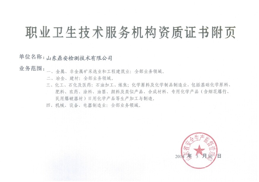 2014年6月13日,山東鼎安檢測(cè)技術(shù)有限公司(以下簡(jiǎn)稱“鼎安公司”)收到了山東省安全生產(chǎn)監(jiān)督管理局頒發(fā)的職業(yè)衛(wèi)生技術(shù)服務(wù)機(jī)構(gòu)資質(zhì)證書(shū)。由此,鼎安公司獲授權(quán),可以在山東省內(nèi)開(kāi)展金屬、非金屬礦采選業(yè)和工程建筑業(yè),冶金、建材業(yè),化工、石化及醫(yī)藥業(yè),機(jī)械、設(shè)備、電器制造業(yè)等四大行業(yè)的職業(yè)衛(wèi)生檢測(cè)和評(píng)價(jià)業(yè)務(wù),業(yè)務(wù)內(nèi)容主要包括各類新建項(xiàng)目職業(yè)病危害因素的預(yù)評(píng)價(jià)、控制效果評(píng)價(jià)以及用人單位職業(yè)病危害因素現(xiàn)狀的檢測(cè)和評(píng)價(jià)。